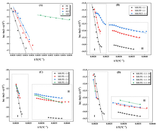 Plots of versus 1⁄T of samples, (A) MR, PE, PP and PET; (B) MR with the addition of PE, PP or PET; (C) MR/PE mixture in different MR to PE ratio; (D) MR/PE mixture under different heating rate. The I zone and the II zone in the subfigure represent the first main pyrolysis stage and the second main pyrolysis stage, respectively.