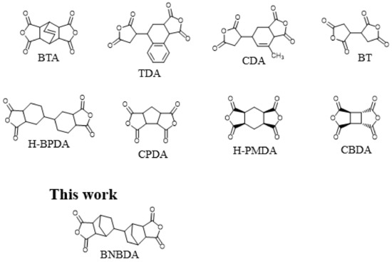 - Tsuda, Y.; Etou, K.; Hiyoshi, N.; Nishikawa, M.; Matsuki, Y.; Bessho, N. Soluble copolyimides based on 2,3,5-tricarboxycyclopentyl acetic dianhydride and conventional aromatic tetracarboxylic dianhydrides. Polym. J. 1998, 30, 222–228. [Google Scholar] [CrossRef]