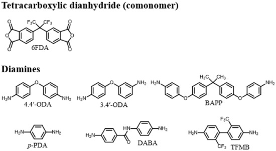 - Matsuura, T.; Hasuda, Y.; Nishi, S.; Yamada, N. Polyimide derived from 2,2′-bis(trifluoromethyl)-4,4′-diaminobiphenyl. 1. Synthesis and characterization of polyimides prepared with 2,2′-bis(3,4-dicarboxyphenyl)hexafluoropropane dianhydride or pyromellitic dianhydride. Macromolecules 1991, 24, 5001–5005. [Google Scholar] [CrossRef]