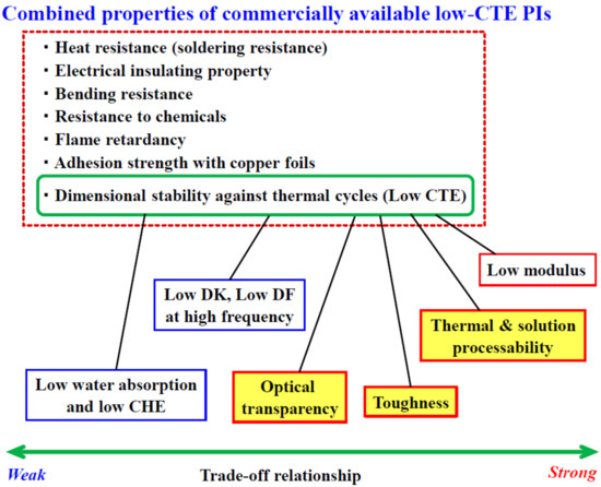 | Low CTE property (LCTE) | CTE (ppm K−1) | ≥70 | 60–50 | 45–35 | 30–20 | ≤10 |