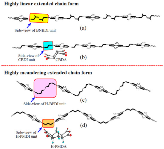 ![]() | (1) | Main-chain linearity/stiffness ↑ | Solubility ↓, film toughness ↓ applicability to polymerization process (T, C, R) ↓ |