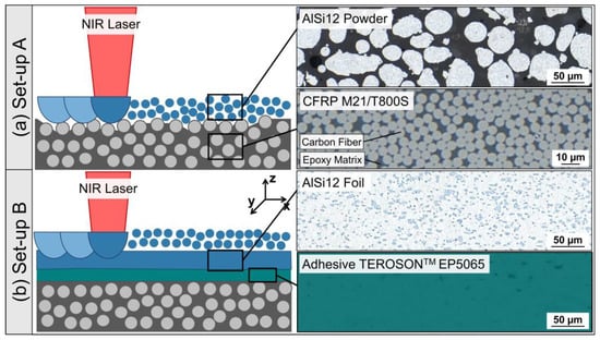 LPBF is based on the layer-by-layer fusion of powder on a substrate with the help of laser energy. First, LPBF experiments were carried out by layering and laser melting AlSi12 powder directly on the CFRP substrate (set-up A); see Figure 1a. In advance, near-infrared (NIR) laser pre-treatment was carried out to ablate the surface matrix layer from the CFRP substrate, herewith exposing carbon fibers targeting an improved bonding with the AlSi12 melt. The CFRP pre-treatment was conducted according to previous studies, addressing the influence of laser pulse parameters on the matrix and carbon fiber ablation behavior [] and correlating them with the bonding strength of hybrid CFRP/Al joints []. Detailed descriptions of the applied laser system and laser parameter with an areal energy density of 0.37 J/mm2 for the matrix ablation are presented in []. After laser ablation, the CFRP substrate was adhesively bonded to a steel build plate with an instant adhesive (Pattex Ultra Gel).