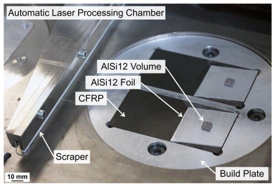 As a result of the findings from set-up A, the substrate structure was modified for further LPBF experiments according to set-up B; see Figure 1b. An AlSi12 foil was laminated on the CFRP as an interlayer between the CFRP and the additively printed AlSi12 powder. In this case, the CFRP and AlSi12 foil were cleaned with acetone and adhesively joined, but the foil should be integrated during CFRP manufacturing for improved process efficiency. Prior to LPBF, the substrates were inserted in steel build plates with an instant adhesive; see Figure 2.