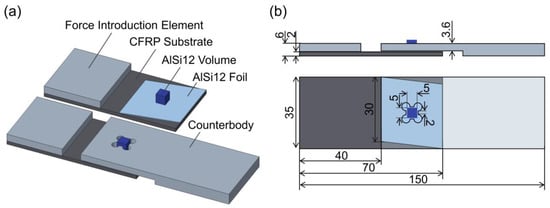 Concept of mechanical strength analysis: (a) specimen set-up for force introduction at the AlSi12 volume/AlSi12 foil interface, (b) specimen geometry and dimensions.