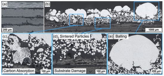 The variation in the different process parameters, such as the laser power, did not render reproducible adhesion and liable bonding between the AlSi12 powder and CFRP substrate. Hence, the results are summarized using the laser parameter VED = 14.4 J/mm3 (Vs = 400 mm/s and P = 65 W) as an example. The cross-section in Figure 4b–e was cut transverse to the laser scanning direction, corresponding to the Y-axis in Figure 4e. LPBF of ten powder layers, each with a 100 µm thickness, caused critical changes within the CFRP compared to its initial state in Figure 4a. Matrix decomposition and fiber fracture led to a partial removal of the first laminate layer to a depth of 250 µm. Close to the substrate, AlSi12 particles were mainly in a loose or partially sintered state up to a 300–400 µm build height, which corresponds to 3–4 powder layers in LPBF; see Figure 4d. In contrast, the area in Figure 4c indicated melted AlSi12 powder with absorbed carbon particles/fibers at the carbon fiber interface. Upper AlSi12 areas showed re-solidified melt spheres (balling) with a diameter of up to 1 mm and a fine dendritic cast microstructure.