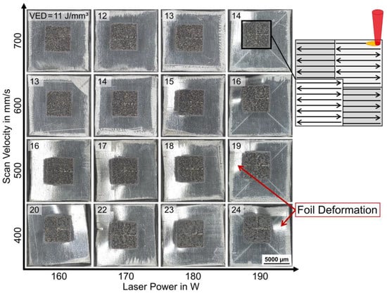 Substrate set-up B: top-view images of AlSi12 volume on AlSi12 foil sections, parameter study with P = 160–190 W and Vs = 400–700 mm/s, resulting VED = 11–24 J/mm3 (upper left corner in each tile image) with chessboard scanning strategy, LM, BF.
