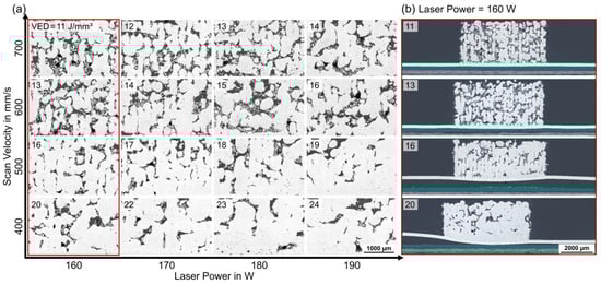 Cross-sections of the specimens were cut and mounted perpendicular to the laser scanning direction of the chessboard scan strategy in LPBF (Figure 5). The results in Figure 6 enabled in-depth microstructural analyses of the density and pore formation in the AlSi12 volume, as well as of the debonding and deformation of the AlSi12 foil. Segmentation and quantification of the cross-section images regarding solid areas and pores revealed density values of ρ% = 67–91% for the AlSi12 volume. The samples showed an increasing density and a reduced lack of fusion porosity at elevated VED, due to an increasing laser power or a decreasing scan velocity; see Figure 6a. Samples with a higher porosity revealed solid structures as narrow lines at a width of about 200 µm, corresponding to the hatch spacing of the laser beam. Specimens with higher VED > 18 J/mm3 fused in the horizontal direction and overcame the linear AlSi12 structures, while the proportion of small round pores increased simultaneously. Samples with low AlSi12 foil deformation with P = 160 W and Vs = 400–700 mm/s were selected for full-area cross-section images in Figure 6b. At higher scan speeds, the bonding between the AlSi12 foil and adhesive layer was intact, while a reduction in the scan velocity caused partial to full debonding as well as significant deformation of the AlSi12 foil.