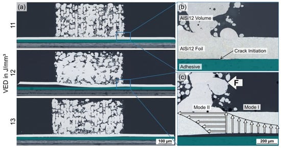 In accordance with the microstructure, the mechanical strength correlated with the laser parameters, reaching superior adhesion at the AlSi12 volume/foil interface with higher VED. When the structural integrity of the AlSi12 volume/foil weld bonds reached τ > 20 MPa, cohesive failure of the AlSi12 foil occurred due to the force introduction into the volume body and resulting stress concentrations at its edge; see Figure 8c. The debonding of the AlSi12 foil at the scan field edges created a multi-axial stress state in this region involving normal and shear stresses. The combination of stress modes I and II exceeded the tensile strength of τ = 185 ± 2 MPa of the AlSi12 foil, which was why failure occurred through the cross-section of the foil.