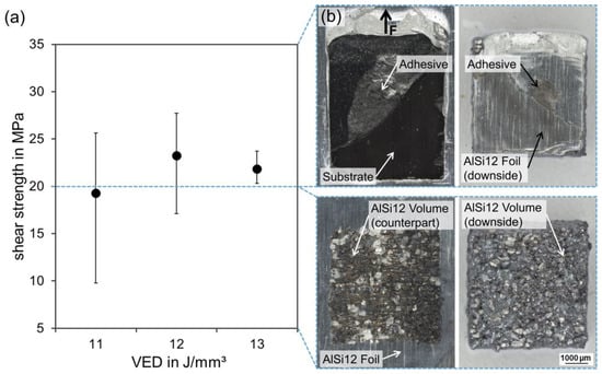 Based on the processing window determined within the parameter study for substrate set-up B, mechanical characterization was carried for samples with the following laser parameter settings: VED = 11–13 J/mm3 (Vs = 700 mm/s and P = 160–180 W). The microstructural analysis of these parameters in Figure 8a revealed debonding of the AlSi12 foil for VED = 12 J/mm3. This was related to the decentral positioning of scan fields on the AlSi12 foil sections (Figure 5) due to the insufficient measuring precision of the scanner head position prior to LPBF, which resulted in a reduction in the underlying adhesive bond area.