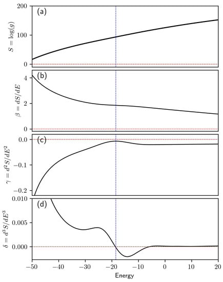 From the density of states, the microcanonical entropy can be recalculated. We then employ the Savitzky–Golay technique [] to remove noise from S and calculate its first three derivatives while preserving the underlying trends. The derivatives of S, denoted as , , and are used to analyze phase transitions.
