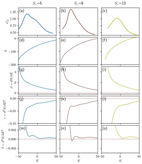 The microcanonical entropy, S, is given for three different values of in Figure 2d–f. The absence of inflection points in the microcanonical entropy suggests that there are no first-order phase transitions in these systems. The derivatives of the microcanonical entropy are presented in the bottom three rows, panels (g)–(o).