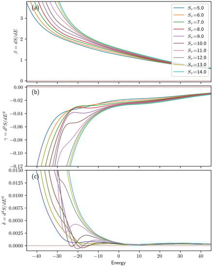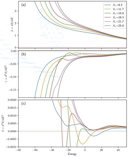 (a) For each value of in the simulation, the first derivative of microcanonical entropy is given as a function of energy. Panels (b,c) present the second and third derivatives of the microcanonical entropy, respectively.