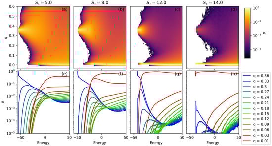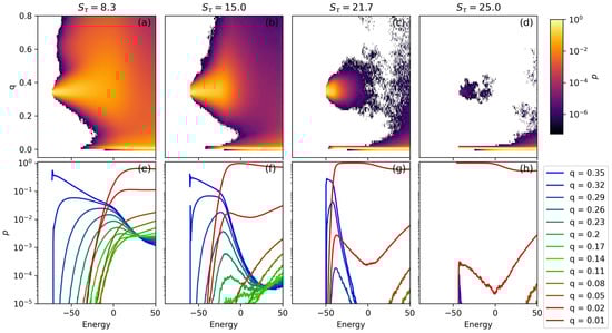 In Figure 4a–d, each panel gives the relative prevalence of structures across a space of E and q. A vertical slice through a single value of energy can be thought of as a normalized histogram of the structures found at each q. Bright yellow regions represent values of q which are highly represented in a single microcanonical ensemble with energy E. Darker regions represent more sparsely populated regions of the q vs. E space. No structures were observed within the bins that are colored white. Because the color scale is logarithmic, small changes in shade can represent rather large differences in structural prevalence. For this reason, panels (a)–(d) should be seen as more qualitative results. In order to read quantitative information from this chart, Figure 4e–h give horizontal cross-sections from each two-dimensional prevalence plot.