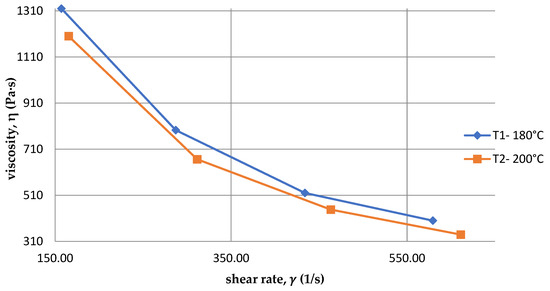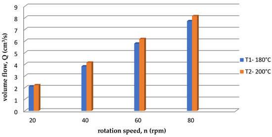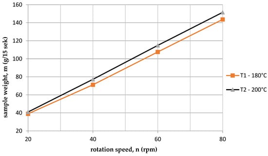 | Screw Rotation n, (rpm) | Average Mass of Samples, (g/s) | Mass Capacity W, (kg/h) | Pressure Drop in the Flow Channel Δp, (MPa) | Volume Flow Q, (cm3/s) | Shear Rate -𝛾̇, (1/s) | Viscosity η, (Pa × s) |