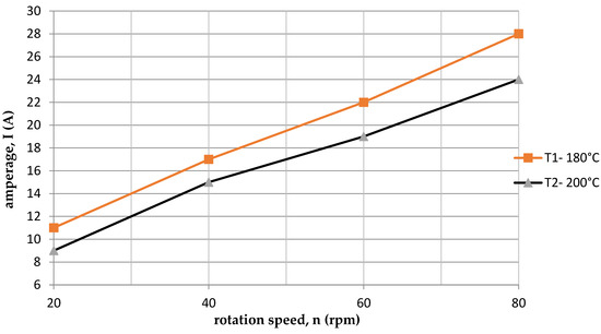- The processing temperature affects the current value. At a lower temperature, the current intensity was higher. This phenomenon is also associated with the occurrence of resistances and the so-called clogging of the cochlea.