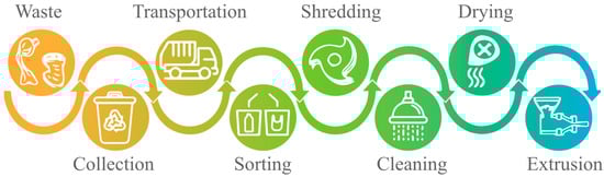 The initial stage of the mechanical recycling process involves the collection of post-consumer materials from households, commercial establishments, and institutions. Effective management of plastic waste requires tailored waste collection methods based on different types of waste and population densities [88]. In densely populated areas where a significant volume of waste is generated, daily household waste collection using specialized vehicles has proven to be an effective method [89]. These vehicles are equipped with specialized equipment to collect, compact, and transport waste to designated waste management facilities. This approach is particularly suitable for densely populated areas where waste accumulates rapidly. Conversely, in areas with lower population densities, cost-effective solutions involve placing bins in the locality that are emptied regularly. This method is suitable for areas where the waste volume does not justify daily waste collection using vehicles. Drop-off recycling is another effective method for managing plastic waste [90]. It involves providing large bins or machines in easily accessible areas such as community centers or nearby residential areas. Residents can conveniently drop off their plastic waste into the designated bins. This method works well for recycling specific types of plastic waste, such as bottles or packaging. Buy-back centers offer fixed or mobile options for exchanging waste for useful items. These centers incentivize residents to recycle their plastic waste by providing rewards in the form of useful items, household goods, or vouchers for local stores [91]. This approach encourages community participation in recycling efforts. Another noteworthy collection method is the deposit or refund system, where waste packaging can be returned for recycling in exchange for credits, cash, or tax returns. This method provides residents with financial incentives to recycle their plastic waste and is particularly effective in countries with low recycling rates, as it offers tangible benefits that encourage participation. By employing diverse collection methods tailored to specific contexts, communities can enhance waste management and recycling practices, promoting a more sustainable approach to plastic waste.