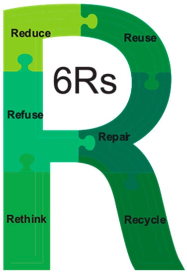 The sustainability framework, developed by multiple industries, provides an outline for waste reduction and the promotion of sustainable practices. The 6 Rs framework shown in Figure 4 includes Reduce, Reuse, Recycle, Repair, Refuse, and Rethink, while the 9 Rs framework expands to include Rs such as Refurbish, Remanufacture, Repurpose, or Recover [142,143,144]. While the first three Rs are widely known and promoted, all the Rs are important for achieving a sustainable future. Repairing and reusing products extends their lifespan and reduces the need for new materials and energy in manufacturing. Refusing single-use products is a critical step for filtering out items that harm the environment. By incorporating all the Rs into the circular economy, society can significantly reduce its environmental impact and promote sustainable practices for future generations [145]. Replacing single-use plastics with environmentally friendly alternatives, such as reusable metal or bamboo straws and refillable glass or stainless-steel water bottles, can significantly reduce waste [146]. Governments and businesses are implementing policies and offering incentives to encourage the use of reusable alternatives to single-use plastics, fostering a shift towards sustainability [147,148]. Integrating plastic recycling into the circular economy is vital for reducing plastic waste, conserving resources, and promoting sustainable practices [147]. These efforts aim to close the loop on plastic waste reduction within the circular economy.