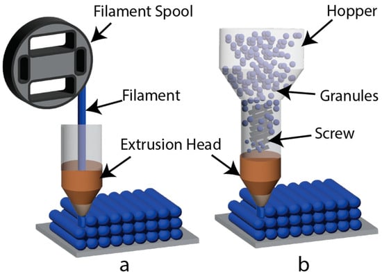Illustration of Additive Manufacturing Techniques: (a) Fused Filament Fabrication and (b) Fused Granule Fabrication.