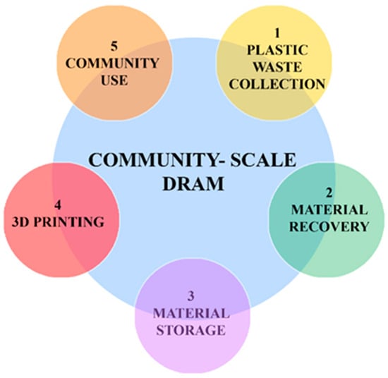 To prepare plastic waste for 3D printing, a series of essential steps are undertaken to transform discarded materials into usable feedstock. The process commences with the collection and sorting of plastic waste, followed by thorough cleaning and shredding into smaller pieces. Subsequently, the shredded plastic undergoes extrusion or other processing techniques to create filament or pellets suitable for 3D printing, as depicted in Figure 6. This transformation is a key factor in converting plastic waste into a valuable resource, promoting sustainability and circularity by reducing environmental impact and maximizing material reuse. Advocating a decentralized approach to waste recycling, our review paper proposes the concept of distributed recycling within the community. This approach eliminates the need for transportation to a centralized recycling center, promoting greater efficiency and reduced logistics. Consequently, our review focuses on the process of establishing a distributed recycling unit consisting of five stages, as depicted in Figure 7. The five stages are: plastic waste collection, material recovery, material storage, 3D printing, and community use. By highlighting these stages, our review aims to promote the implementation of an effective distributed recycling unit, fostering community involvement and contributing to a more sustainable and responsible waste management system.