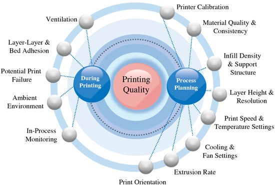 Ensuring that recycled plastics meet the required specifications for 3D printing can be difficult. Moreover, recycled thermoplastic materials may exhibit different physical characteristics compared to virgin materials, potentially influencing the performance of the printed object. Variations in melting points, viscosities, and flow characteristics can affect printability, leading to issues such as warping, poor layer adhesion, and surface finish problems [174]. This can lead to issues such as inadequate layer adhesion, stringing, and clogging, which can compromise the quality of the print [175]. Furthermore, achieving proper adhesion of the material to the print bed can be challenging, especially when using recycled polymer materials that may have different surface qualities compared to virgin materials. This can result in problems such as warping and poor layer adhesion, affecting the overall print quality. Additionally, factors such as print speed, layer height, and cooling settings can have a significant impact on printing quality and may contribute to failed prints [176], which will be discussed in Section 3.4.