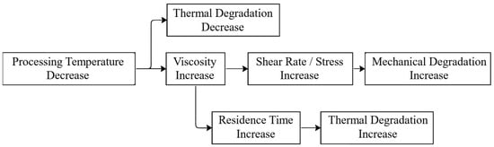 As previously mentioned, mechanical degradation alone is not the primary accelerator of polymer degradation. It is the concurrent occurrence of thermal, moisture, or other degradation processes during processing that accelerates the degradation. Moreover, certain degradation factors can amplify the other’s effects, further hastening the degradation process. Thermal degradation plays a significant role in influencing the mechanical properties of processed polymers. When plastics are exposed to higher temperatures during the melting process, thermal degradation can occur, leading to the breaking of the polymeric chain’s weakest bonds and causing a reduction in the compound’s molecular weight [119]. The thermal stability of a polymer is determined by the strength of its weakest bonds [120]. In addition to thermal degradation, the presence of aggressive chemical substances can significantly impact the polymer when exposed to heat. For instance, the interaction between oxygen and the polymer can result in a specific type of degradation known as thermal oxidation [121]. This occurs when oxygen reacts with the polymer, causing further deterioration. Excessive thermal degradation is particularly relevant in the recycling process, especially when dealing with polymer blends. Due to the varying melting temperatures of different plastics, recyclers often encounter challenges in reprocessing plastics based solely on the melting temperature of a single component. As a result, some elements may not melt at all, while others experience excessive thermal degradation.