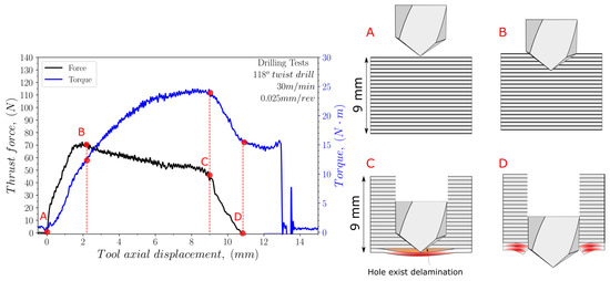 For the 118° twist drill geometry (see Figure 4), the thrust force is the maximum when the entire conical shape of the drill has entered the specimen (point B). Then, it decreases slightly along the thickness of the sample with the machining of the different layers until the bottom surface is reached (position C). In the case of the torque evolution, the values obtained during drilling progress until reaching the maximum at position C, when the drill comes to the last layers of the sample. The drill exits the material between positions C and D, which is associated with reducing the force to reach a valley.