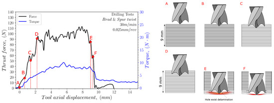 Evolution of both the thrust force and torque during the drilling of the UHMWPE composite with the brad and spur drill geometry (A–F letter correspond to different instants during the drilling operation).
