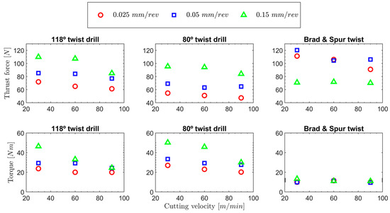 In Figure 7, the thrust forces and torques of the brad and spur drill with respect to the 118° and 80° twist drill geometries are represented. For this drill, a different trend appeared in the thrust forces that had not been observed for the rest of the tested tools. The first significant observed effect is that for feeds of 0.025 and 0.05 mm/rev, the thrust forces generated by the brad and spur drill are greater than those obtained for the 118° twist drill and lower in the case of the 0.15 mm/rev feed.