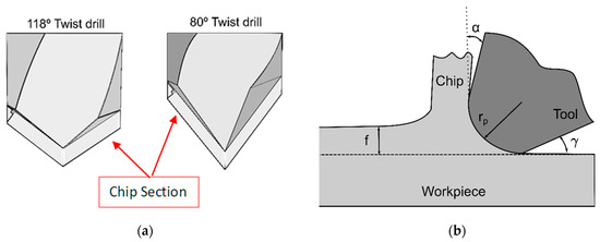 Figure 7 compares the forces and torques obtained with the 118° and 80° twist drill geometries. The same trends obtained for the 118° twist drill were observed again for the 80° twist drill. Thus, the forces and torques both increased and decreased as the feed and cutting speed increased, respectively. These results agree with those obtained by other authors in drilling pieces of the UHMWPE material [25,28]. However, as expected for the 80° twist drill, the obtained thrust force values were significantly lower, up to 25% in the worst case, while the average torque values were 14% higher under the tested conditions. In the case of the 80° twist drill, as shown in Figure 8a, the chip is thinner, and the length of the edge in contact with the material is greater than that of the 118° tool. This causes two effects to appear: on the one hand, there is greater friction between the tool’s edge and the material, which produces more significant heating of the material due to friction. Therefore, it causes the temperatures reached by the material under the tip of the drill to increase to a greater extent than that for the 118° twist drill, which softens the material; therefore, less thrust force is required to remove the material than that required with the 118° twist drill geometry. On the other hand, the radius of the sharp edge of the tool has a greater effect on the cut, producing an increase in the torque because the effective rake angle is smaller. Figure 8b shows the effect of the cutting edge’s tip radius with respect to the feed.