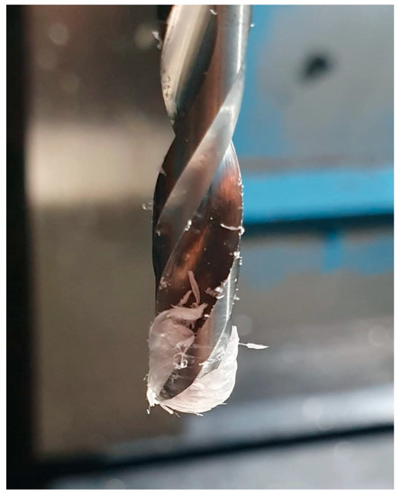 Concerning the torque, for all the cases, lower values are observed than those obtained for the 118° twist drill. In the specific case of the brad and spur drill, a different behaviour was noted concerning the impact of the feed on the thrust force. Increasing the feed per revolution did not increase the thrust force owing to the larger chip section. In fact, when feeds ranged from 0.05 to 0.15 mm/rev, the thrust force was reduced across all the tested speeds. The reason lies in the complexity of the tool’s edge. This means that the chip exit is not as direct as those for the other two tested geometries. In this case, unlike when this geometry is used for machining thermosets, the fibres have excellent flexibility and, at the same time, high strength, on the order of 7 GPa, and a modulus of 235–325 GPa [45]. These features show that the material tends to adhere at the tip of the drill, even melting, to generate a stopper, like the one shown in Figure 9, for feeds of 0.025 and 0.05 mm/rev. Owing to this adhered material, the recorded thrust force was higher for the lower feeds (0.025 and 0.05 mm/rev). Thus, authors have already reported a similar fact during the machining of aramid composites with the same geometry and low feed rates [2].
