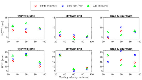 The delamination damage was quantified for each test, represented in Figure 10, for all the cutting parameters and drill geometries at the tool’s entrance and exit.