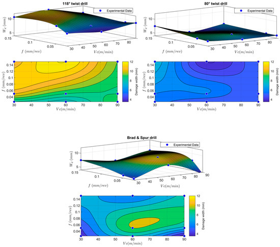 The analysis of the delamination damage can also be visualised in a clearer 3D map for the three different investigated drill geometries and cutting conditions, as shown in Figure 12. The 3D map clearly shows that the 80° twist drill has the best performance in terms of minimising delamination damage, making it suitable for manual drilling where precise control over the feed and cutting speed may not be achievable.