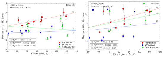 The authors have tried to establish a correlation between the thrust force and the delamination factor at the entry and exit sides, as shown in Figure 13. However, a nonclear tendency can be highlighted. Apparently, as the thrust force increases, the delamination factor increases for both tested twist drills, but it is not fulfilled in all the cases. Hence, the thrust force cannot be taken as a variable to predict delaminations in the studied material. In the case of the brad and spur drill, as previously mentioned, owing to the significant problem with the adhesion of the material on the tip of the tool, which directly affects the thrust force, a non-reliable correlation can be established.