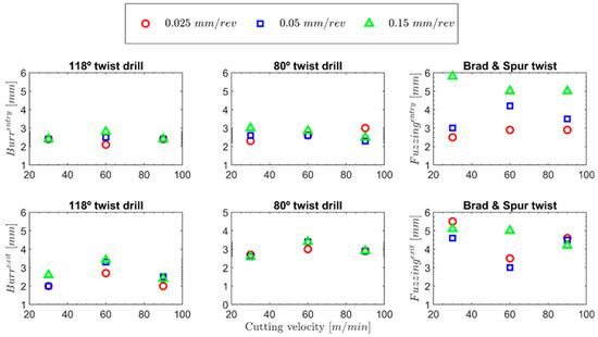 In the case of the burrs at the entrance, note that as in the case of delamination, this does not seem to be influenced much by the cutting speed. The effect of successive passes on the accumulation of heat, which could soften the material at the edge of the hole, causing it to soften, is not so marked. Also, the generated heat is more easily absorbed more quickly by convection and conduction in the area than at the bottom of the hole. However, it does seem to be more sensitive to the feed value of the drill, mainly owing to the larger chip section, as authors have previously demonstrated [42].