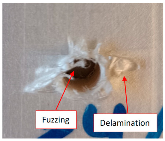 During the development of the drilling tests, delamination, burrs, and fuzzing were the main damage modes in the processing of the UHMWPE composite material. This damage was determined visually by means of the calculation of the maximum diameter within the damage that appears throughout the images that were obtained using an optical microscope (Optika SZR, Ponteranica, Italy). Delamination appears during the processing of the material, both at the entrance and at the exit, due to the pull out of the layers during the entry of the drill by means of its cutting edges or as a response to the push out of the tool in the last layers at the exit. Therefore, this leads to an increase in the thickness of the workpiece in the affected area and a reduction in its properties due to the separation of the material layers (Figure 3a).