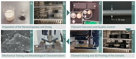 Flow diagram illustrating the experimental approach used accompanied by photos that show each step of the process (A) raw material, (B) drying of the raw material, (C) filament extrusion, (D) filament inspection, (E) filament drying, (F) MEX 3D printing of the samples, (G) mechanical testing (three-point bending is presented in the image), (H) morphological analysis with SEM.