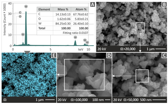 The investigation of the WC powder. (A) EDS graph analysis to determine the elemental composition, (B) SEM images captured at 20,000× amplification, (C) SEM images captured at 50,000× amplification on the region shown in (B), (D) SEM images captured at 100,000× amplification on the area presented in (C), and (E) EDS mapping on the region shown in (D) demonstrating the uniform dispersion of the tungsten (W) element.