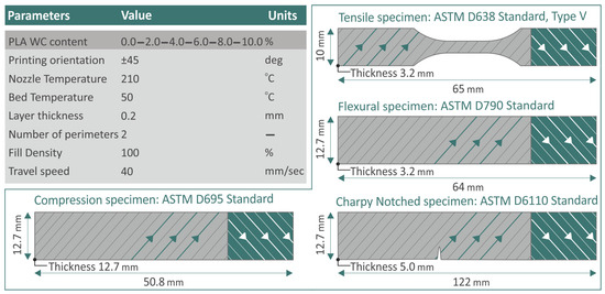 Two extrusion steps were employed to create filaments made of PLA/WC nanocomposites at the aforementioned loadings. The filament of the pure polymer was also created as the control sample. These filaments were utilized to create specimens using the Intamsys Funmat-HT 3D Printer from Shanghai, China. To identify the factors for generating 3D-printed objects, the software platform Intamsuite (version 4.2), also created by Intamsys (Shanghai, China), was utilized, and these parameters were established through a process of trial and error before starting the sample manufacturing procedure and by referring to the corresponding literature, for example, [15]. Then, the required G-codes for the 3D-printing procedure were produced. For each test, the samples were produced in compliance with the dimensional requirements listed in the relevant ASTM specifications. These specifications cover the following: ASTM D638-02a [56] for conducting tensile experiments, ASTM D790-10 [57] for conducting flexural investigations, ASTM D6110-02 [58] for conducting Charpy notched impact investigations, and ASTM D695 [59] for conducting compression tests. The samples were produced with a 100% infill, indicating that the interior of the 3D-printed object was almost solid [15]. The rectilinear infill pattern, which fills the object’s interior space with a grid-like structure, was used. In addition, the raster direction was altered from +45 degrees to −45 degrees for each subsequent layer. A summary of the 3D-printing factors utilized in this investigation is shown in Figure 3.