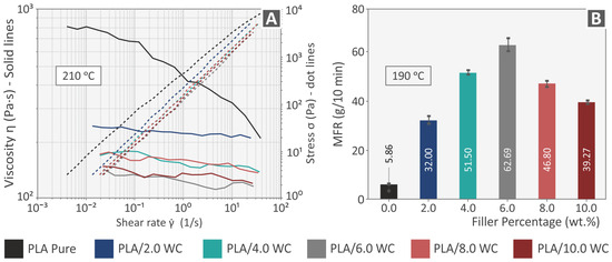 Rheological investigation of the pure PLA polymer and PLA/WC composites: (A) viscosity and stress versus shear rate and (B) melt flow rate versus filler percentage.