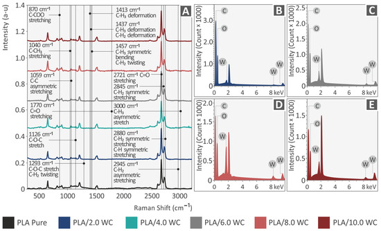 (A) Raman spectra from pure PLA, PLA/2.0 WC, PLA/4.0 WC, PLA/6.0 WC, PLA/8.0 WC, and PLA/10.0 WC and EDS investigation for the PLA/WC composites: (B) PLA/2.0 WC, (C) PLA/6.0 WC, (D) PLA/8.0 WC, and (E) PLA/10.0 WC.