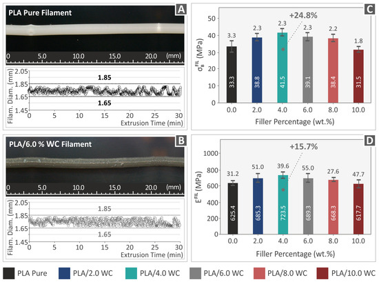 Real-time measurements of the extruded filament segments for two types of filaments: (A) PLA and (B) PLA/6.0 WC. (C) The results of the tensile experiments performed on the filament and (D) the obtained results for the filament’s modulus of elasticity.