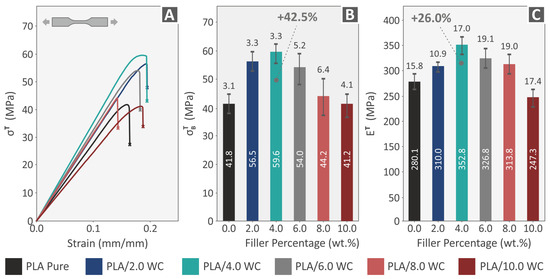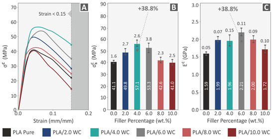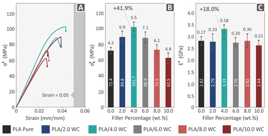 A review of the flexural characteristics of the samples made from the pure PLA and PLA/WC composites is presented in Figure 11. Figure 11A exhibits the flexural stress–strain curves. The 3D-printed samples’ typical values of the flexural strength and modulus of elasticity are shown in Figure 11B,C, correspondingly. The ASTM D790-10 standard instructs that the flexural examinations should be terminated at a maximum strain of 5%. The samples tested in this paper failed at lower strain values; so, the 5% threshold instructed by the standard was not reached. All the composites showed noticeable gains in their flexural strength, with the exception of the samples with the greatest WC filler loading (10.0 wt. %). The greatest improvement in flexural strength occurred at a compound loading of 4.0 wt. %, which resulted in maximum flexural strength of 102.7 MPa, with a considerable increase of 41.9% over that of the raw PLA. The compound with a 4.0 wt. % loading also showed the maximum flexural modulus of elasticity with a value of 3.33 GPa, demonstrating a considerable increase of 18.0% in relation to the raw PLA sample. It can be assumed that the improvement in the flexural characteristics of the specimens reached the saturation point after the 4.0 wt. % WC filler loading.