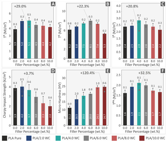 Furthermore, the compression toughness and elastic compression modulus both noticeably increased up to a 6.0 weight percent filler loading, for which the highest achieved values of 38.8% and 22.3% were observed, respectively. The microhardness showed a steadily rising improvement, reaching a maximum of 120.4% at an additive loading of 10 wt. % when compared to the pure matrix. Such a high performance in the microhardness tests was expected due to the specification of the WC ceramic and makes the nanocomposites investigated in this paper suitable for applications requiring high wear resistance from the material. Still, it should be noted that the performance of the 10 wt. % nanocomposite in the remaining mechanical tests was not as high. Therefore, according to the specifications set in each application, the WC concentration in the nanocomposite should be adjusted accordingly. A high strength in the tensile and flexural tests can be achieved with 4 wt. % loading and, in cases in which high wear is the priority, WC can be further increased up to 10 wt. %. Only the impact strength exhibited a reduction in the final mechanical responsiveness. All the compounds showed decreased values than those of the PLA material, with the exception of the PLA/WC 2.0 wt. %, which showed an increase when compared to the pure PLA. Except for their performance under impact loads, the improvement in the generated compounds appears to be directly influenced by the WC content. The decrease in the mechanical performance of the nanocomposite with the highest loading of 10 wt. % can be attributed to the saturation of the WC nanoparticles in the nanocomposites. In this work, the filler loading was gradually increased, the mechanical tests were conducted, and the experiments stopped when the mechanical performance started to consistently decrease. The saturation of the filler has a negative effect on the mechanical response of the nanocomposites [93], and this was the outcome in most of the mechanical properties except for the microhardness, which was increased. At the 10 wt. % loading, agglomerations of the WC particles were also formed, which also negatively affects the mechanical response [94]. The increase in the microhardness with the increase in the filler was expected. The increased concentration of the very-hard WC nanoparticles in the nanocomposites led to this effect.