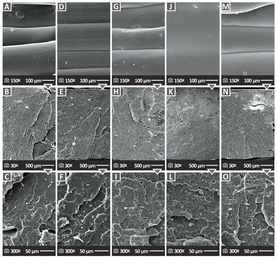 Figure 13B,E,H,K,N depict the fractured surface at a 30× magnification, and Figure 13C,F,I,L,O depict the fractured surface at a 300× magnification. All of the specimens as shown at 30× magnification exhibited microvoids, which are attributed to the layer-by-layer construction of the samples during the MEX 3D-printing process, even though a 100% infill ratio was used. It is worth mentioning that these microvoids are frequently seen in the structure of 3D-printed objects [83]. The higher magnification of 300× of the samples using SEM imaging demonstrated that the filament strands were not significantly deformed.