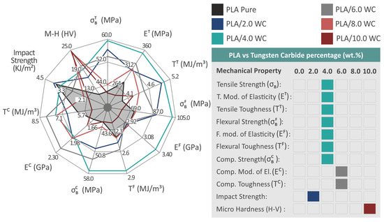 A summary of the mechanical experiments conducted on the composites subjected to examination and the raw PLA material is illustrated in Figure 15. The introduction of WC NPs into the PLA matrix enhanced the polymer’s mechanical response.