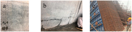 High-strength large-volume marine concrete presents challenges in the installation of water pipes and exhibits evidence of cracking: (a) Vertical cracking of concrete; (b) Horizontal cracking of concrete; (c) Inconvenience in the installation of cooling water pipes.