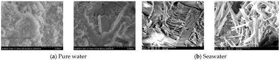 Products in cementitious slurries after 365 days of immersion curing and seawater erosion: (a) Pure water; (b) Seawater.