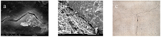 Cracks induced in large-volume concrete due to the thermal expansion of fiber reinforcement: (a) Microscopic cracks; (b) Submicroscopic cracks; (c) Macroscopic cracks.