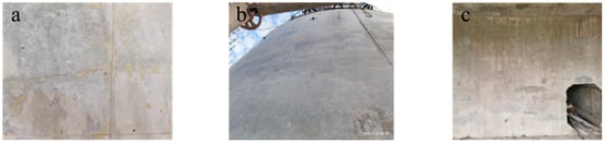 Comparison of the crack control effectiveness by incorporating heat-shrinkable fibers: (a) Significant fissures observed in the absence of heat-shrinkable fibers; (b) Solid segment of Huangmaohai main tower and Shitan Bridge; (c) Absence of fissures upon the incorporation of heat-shrinkable fibers.