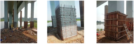 - Sun, Z.Y.; Zhou, J.J.; Wang, D.M.; Zhang, J. Temperature Control for Mass Concrete Construction of Wentang Bridge 5# Pier Pile Cap in Winter Construction. J. Phys. Conf. Ser. 2023, 2476, 012079. [Google Scholar]